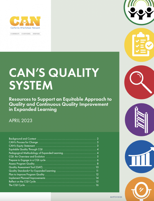 This document provides an overview of resources and strategies to support a comprehensive and equitable approach to Quality and Continuous Quality Improvement (CQI) for Expanded Learning and other Out-of-School Time (OST) programs. It provides an overview and description of how to use CAN’s Quality System consisting of three resources to support the CQI process.