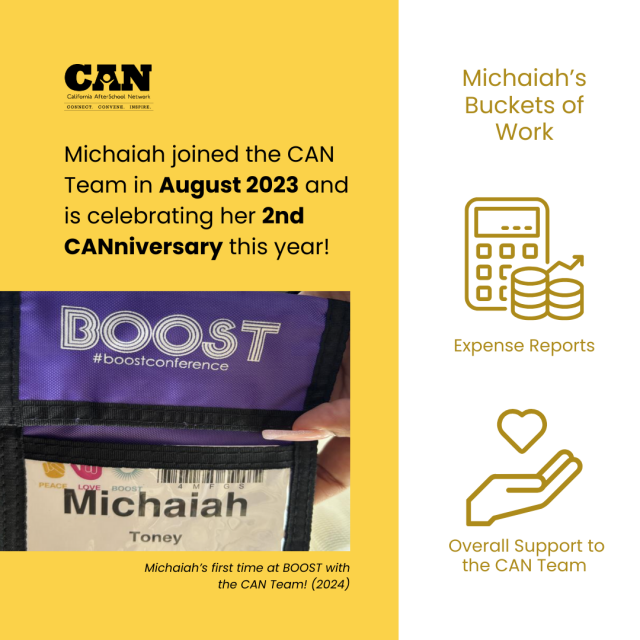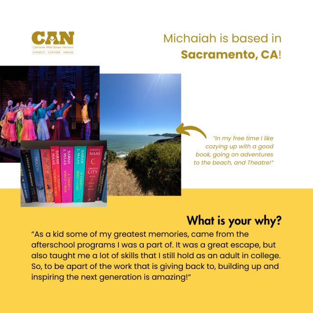 I am Michaiah (She/Her) the Student Assistant for Equity and Quality for the California AfterSchool Network (CAN). I joined the team in August 2023 and I am excited to be a part of a space that allows me the capacity to grow and learn.