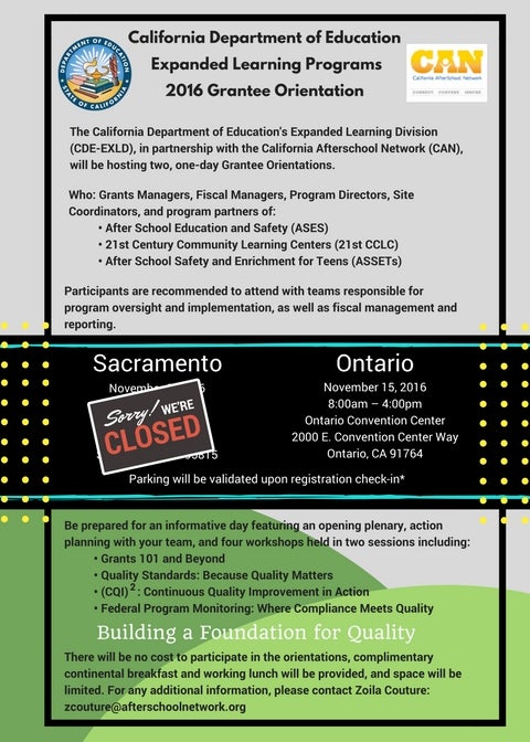 The California Department of Education’s Expanded Learning Division, in partnership with the California AfterSchool Network, will be hosting two, one day Grantee Orientations for After School Education and Safety (ASES) and 21st Century Community Learning Centers (21st CCLC) Grantees. Orientations will take place in Ontario on November 15th and will feature an opening plenary, action planning with your team, and four workshops (Grants 101 and Beyond, Quality Standards: Because Quality Matters, (CQI)2 Continuous Quality Improvement in Action, and Federal Program Monitoring: Where Compliance Meets Quality). Participants are recommended to attend with teams responsible for program oversight and implementation, fiscal management and reporting (e.g., Grant/Fiscal Managers, Program Directors, Site Coordinators, and ASES & 21st CCLC program partners). There is no cost to participate in the orientations and space is limited. Registration is now closed. For any questions or additional information, please contact Zoila Couture.